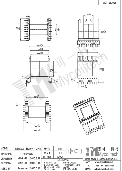 5+5 Pins Vertical Bobbin,Phenolic Material,UL REC:94V-0 Pin pitch=3mm, Parallel Distance=10.3mm Size=16.4mmX13mmX16.5mm